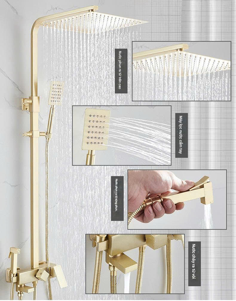 | Số lượng chế độ nước | 4 Chế độ: Sen Mưa Lớn / Tay Cầm / Vòi Rửa Mạnh (Vuông) / Vòi Xuống Nước |