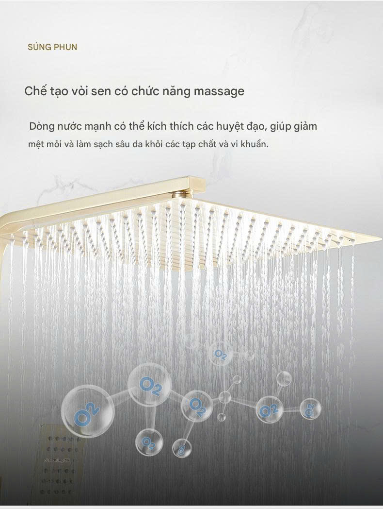 Điểm nhấn ấn tượng nhất chính là sen mưa khổng lồ đường kính lên tới 12 inch (~30cm). Với diện tích phủ nước rộng lớn cùng gần 200 lỗ phun được bố trí khoa học, mỗi lần tắm sẽ như một buổi trị liệu dưới cơn mưa rào tự nhiên, xoa dịu mọi căng thẳng và làm sạch cơ thể một cách triệt để.