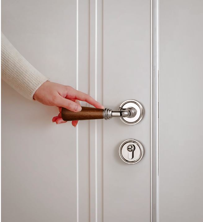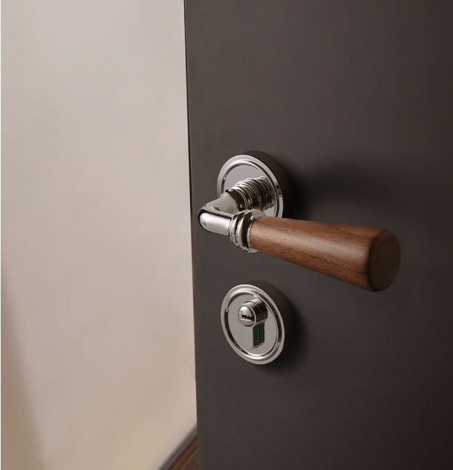 Khóa cửa tay gạt mã 048 sở hữu thiết kế tối giản, tay nắm gỗ óc chó được gia công mịn, kết hợp cùng thân khóa kim loại tạo điểm nhấn sang trọng cho cánh cửa.